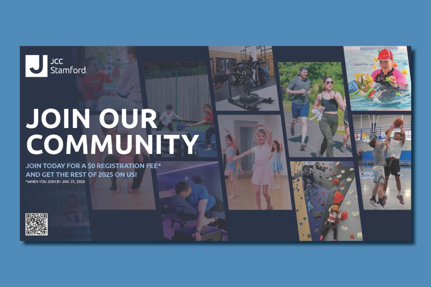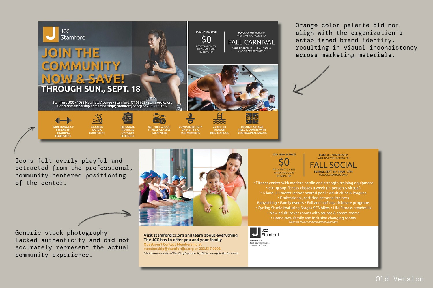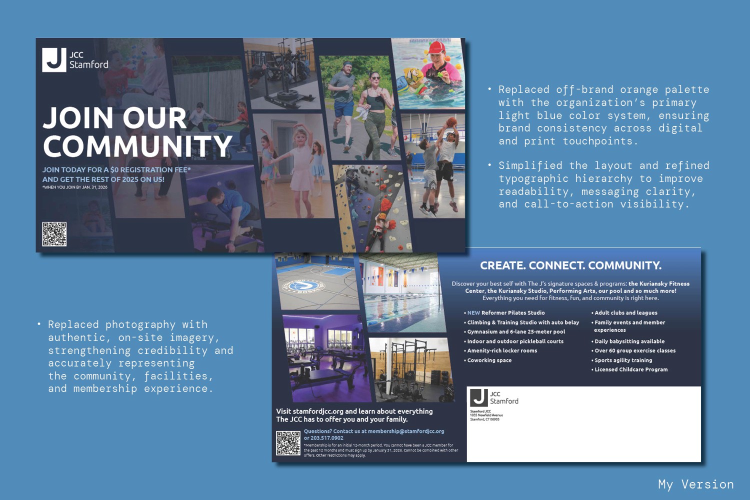 Led a strategic redesign of the JCC Stamford membership marketing materials to modernize an outdated visual system and better reflect the energy of the community. Replaced heavy layouts and dated color blocking with a cleaner, image-driven composition featuring dynamic photo grids, bold typography, and a refined blue palette for stronger brand alignment. Improved hierarchy, readability, and call-to-action placement while integrating QR codes and updated messaging to enhance engagement and accessibility. The result is a cohesive, contemporary campaign that communicates vibrancy, inclusivity, and the full scope of programs offered.
